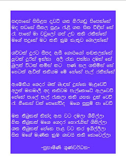 නිලුපුල ඔබයි සිත් විල කළඹන නිසල බිමි කඩ ඔබයි කතරක දිය බිඳු ඉසින ඉඳුවර දෙනෙත් තුල නිකැලැල් බව සිඹින සෙනෙහස කොහේ සැඟවි යා දෝ විටෙක ඉරබටුවකින් අසමින් මග ගෙවා දුර වළාකඩින් වසමින් හිරු කිරණ මැඩ නොපෙනෙන තරු පොකුරු මැද හිඳ සිනාවෙන සිහසුන ඔබයි සෙනෙහේ දිය සතපවන මාලති මලින් මල්කම් කර කැටයමට විලිකුන් පඳුරකින් තොරණක් ගසා හැඩ සියොතුන් ඉගිලයනවිට දසතම පැතිර ඔබමයි මගේ හදවත දිනු සෙනෙහෙ විල